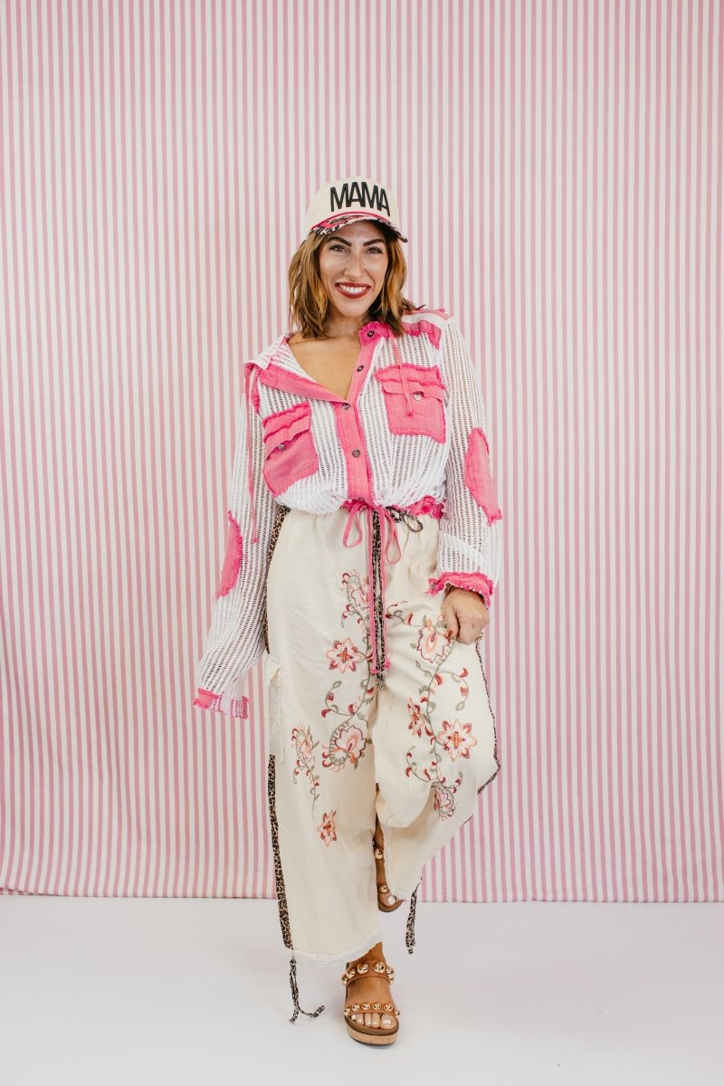 These embroidered boho lounge pants are the perfect mix of comfort and statement style. Designed with soft breathable cotton and beautiful floral embroidery, they bring an elevated artisan feel to your everyday wardrobe. The contrast leopard trim along the sides adds a fun unexpected edge, giving these pants that standout boutique look your Macoma girls love.
