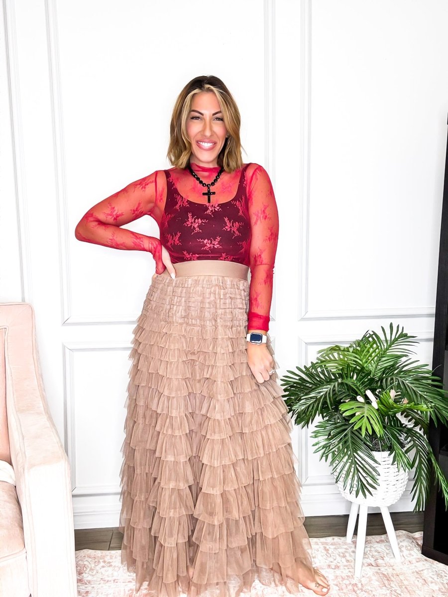 Introducing the Cascading Grace Maxi Skirt - perfect for any occasion! This stunning skirt features a high waist with an elastic band for a comfortable and flattering fit. The tiered tulle mesh adds a touch of elegance, while the inner lining provides coverage. Elevate your look and feel confident in this mocha-colored beauty.