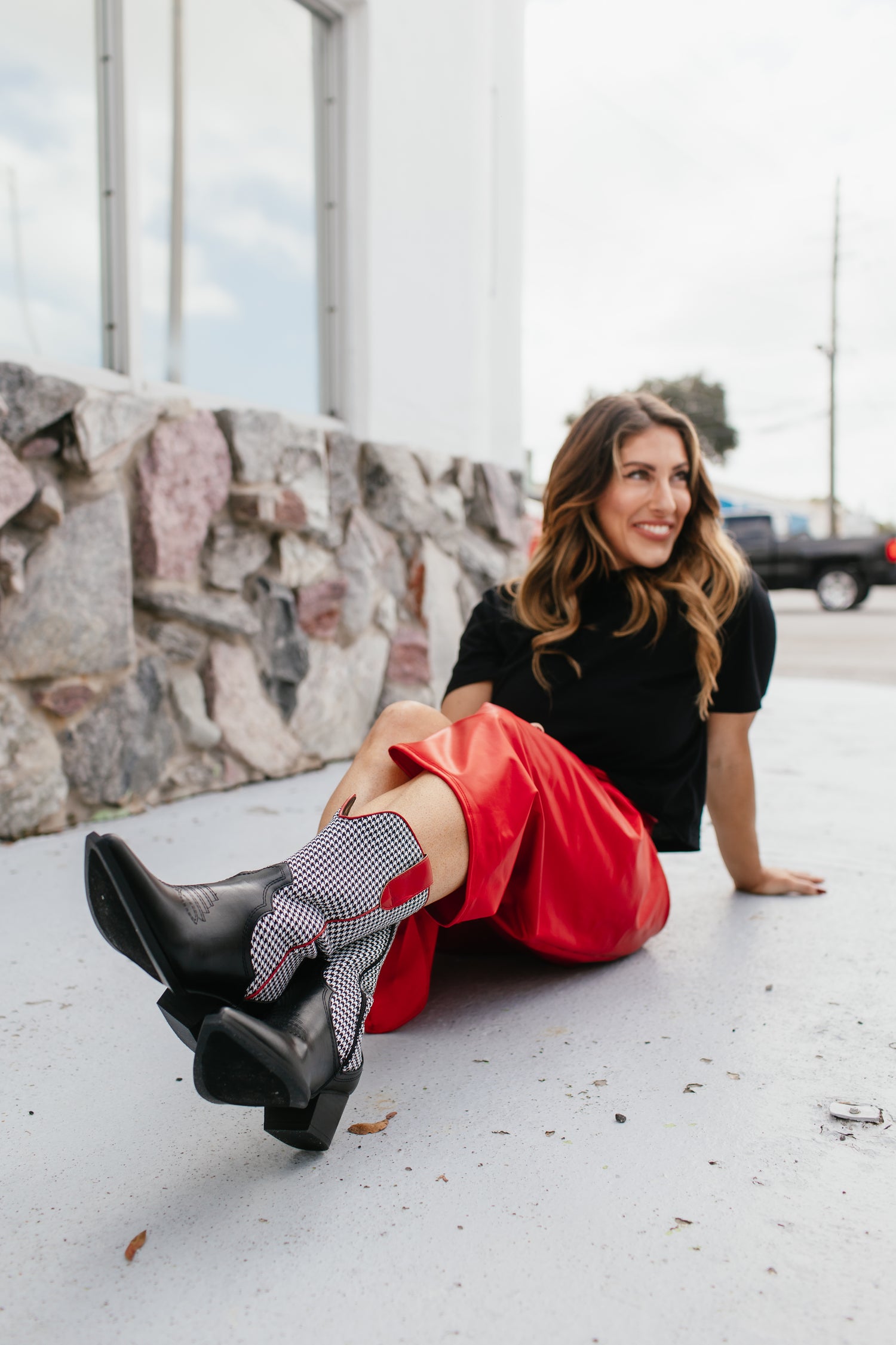 Add a pop of sass to your step with the Rodeo Rebel Houndstooth Boots! Featuring a striking black-and-white houndstooth pattern trimmed with bold red accents and smooth black faux leather, these standout cowgirl boots blend classic Western with runway-ready edge. Perfect for game day, concerts, or any outfit that needs a little extra yee-haw.