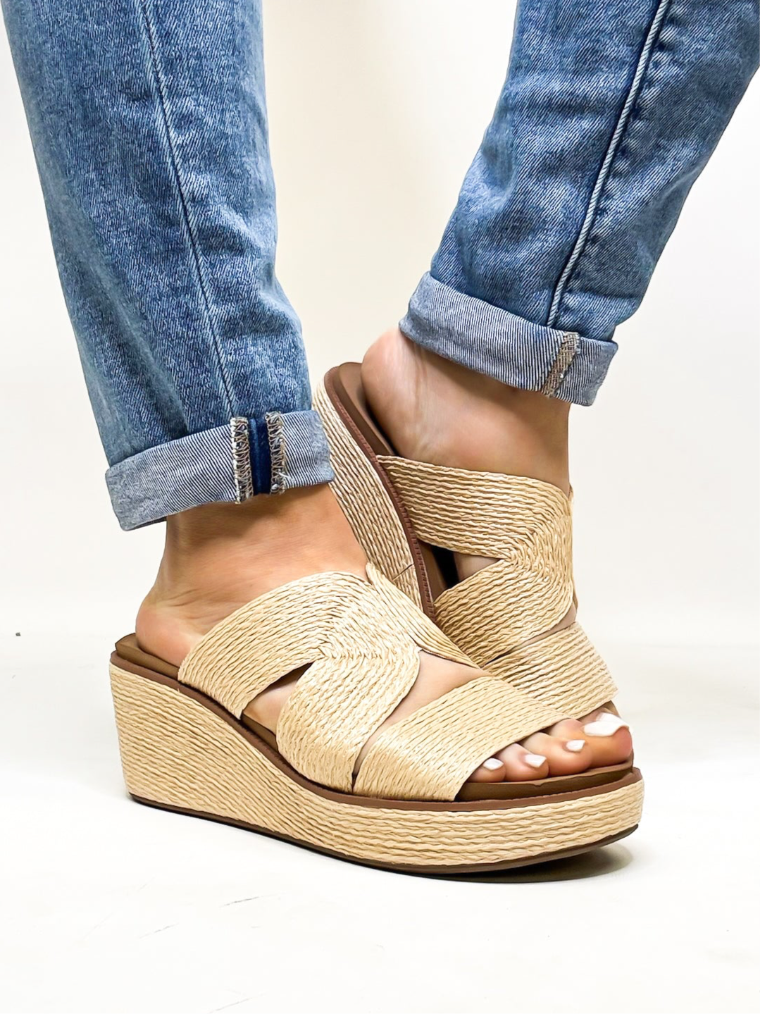 This shoe showcases a stylish pair of wedge sandals with a woven raffia design. The sandals feature wide crisscross straps that provide a secure yet breathable fit. The wedge heel is also wrapped in a similar woven material, creating a cohesive and elegant look. The sole appears to be cushioned for added comfort, making these shoes perfect for casual outings, summer vacations, or beachside strolls. Paired with rolled-up denim jeans, these sandals add a touch of relaxed sophistication to any outfit.