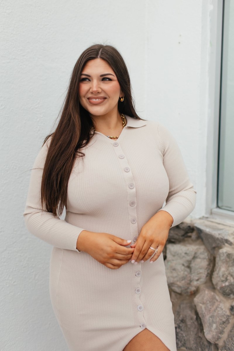 This ribbed button-front midi dress is the perfect mix of polished and effortless. Designed with a flattering V-neckline, collared detail, and a body-skimming silhouette, it creates a sleek, feminine look that’s easy to dress up or down.