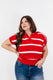 Keep it classic and cool with this red and white striped knit polo top. Featuring a soft, stretchy ribbed texture and a flattering banded hem, this wardrobe essential is as comfy as it is timeless. Pair it with denim for a polished casual vibe or tuck it into trousers for a chic, effortless look.