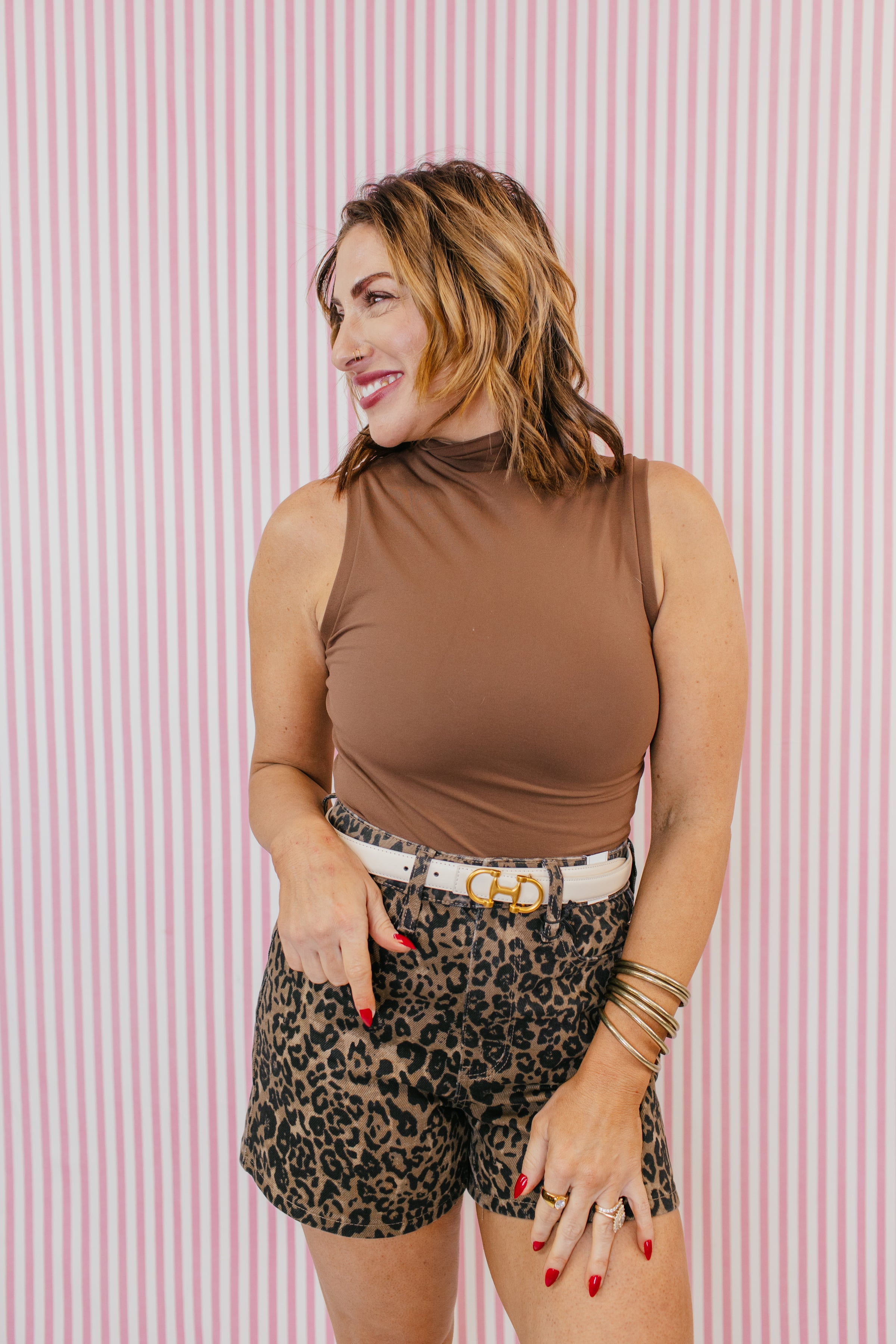 Turn heads and own your bold side in these statement-making leopard shorts. Designed with a flattering high-rise fit and structured cotton denim feel, they bring the perfect mix of edgy confidence and everyday versatility. The neutral animal print makes styling effortless while still giving your outfit that standout boutique vibe.