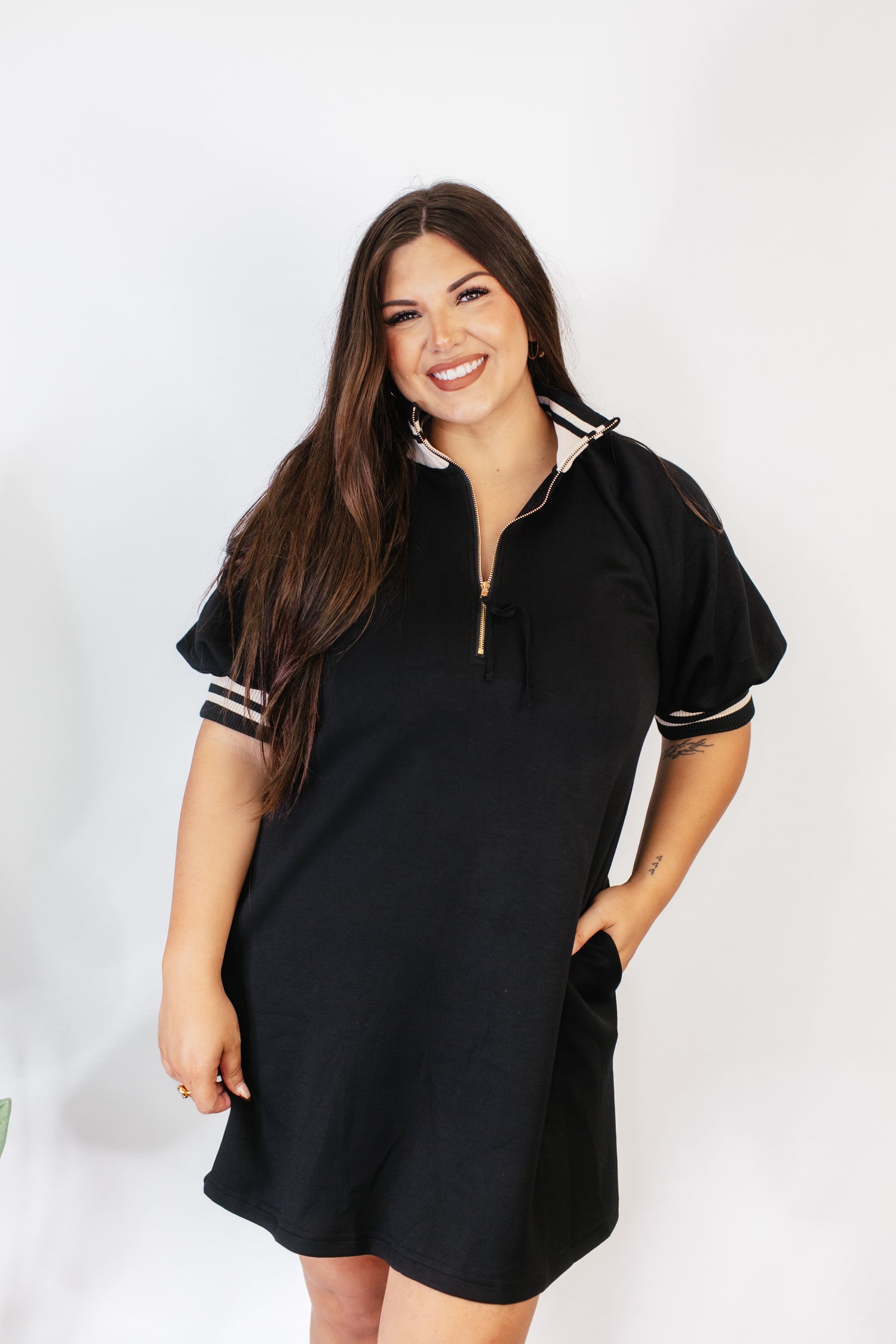 Bring a sporty edge to your everyday style with this Black Zip Polo Dress – a must-have for casual chic dressing. Designed with a half-zip polo neckline, this piece balances polished structure with relaxed comfort. The striped ribbed trim at the collar and sleeves delivers an athletic-inspired vibe, while the relaxed shift fit ensures all-day ease.