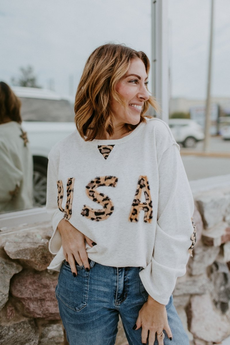 Bold, playful, and full of attitude—this statement top says it all. Designed in a soft, heathered neutral knit, it features raised leopard-print lettering that spells out “USA” for a look that’s chic.