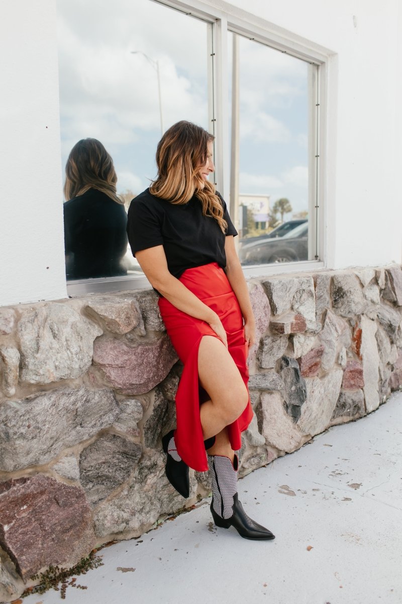 Add a pop of sass to your step with the Rodeo Rebel Houndstooth Boots! Featuring a striking black-and-white houndstooth pattern trimmed with bold red accents and smooth black faux leather, these standout cowgirl boots blend classic Western with runway-ready edge. Perfect for game day, concerts, or any outfit that needs a little extra yee-haw.