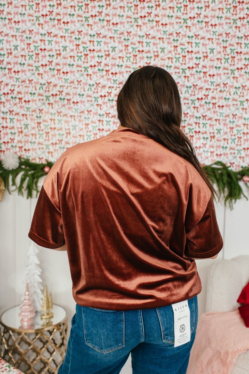 Bring the glam with this brown velvet mock neck top that takes your outfit from simple to stunning in seconds. With its silky-smooth finish, relaxed drape, and chic high neckline, this top is the ultimate mix of comfort + luxe. Pair it with sequins for holiday parties or with your favorite denim for an elevated everyday look.