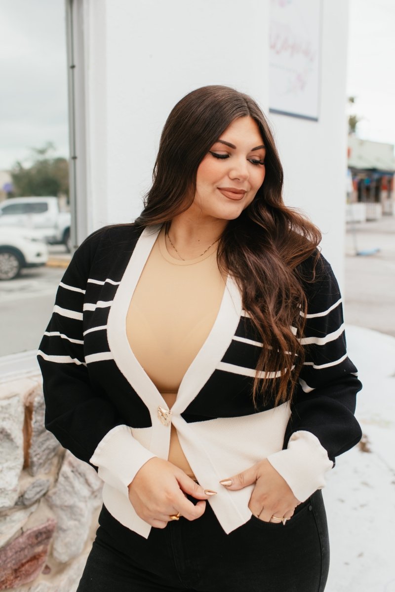 Upgrade your layering game with this chic striped cardigan that’s equal parts cozy and polished! With its contrast cream trim and bold black base, this piece gives you a classic-meets-modern vibe you’ll love. Whether you’re dressing it up with denim or keeping it comfy with leggings, this cardigan adds effortless sophistication to any look.