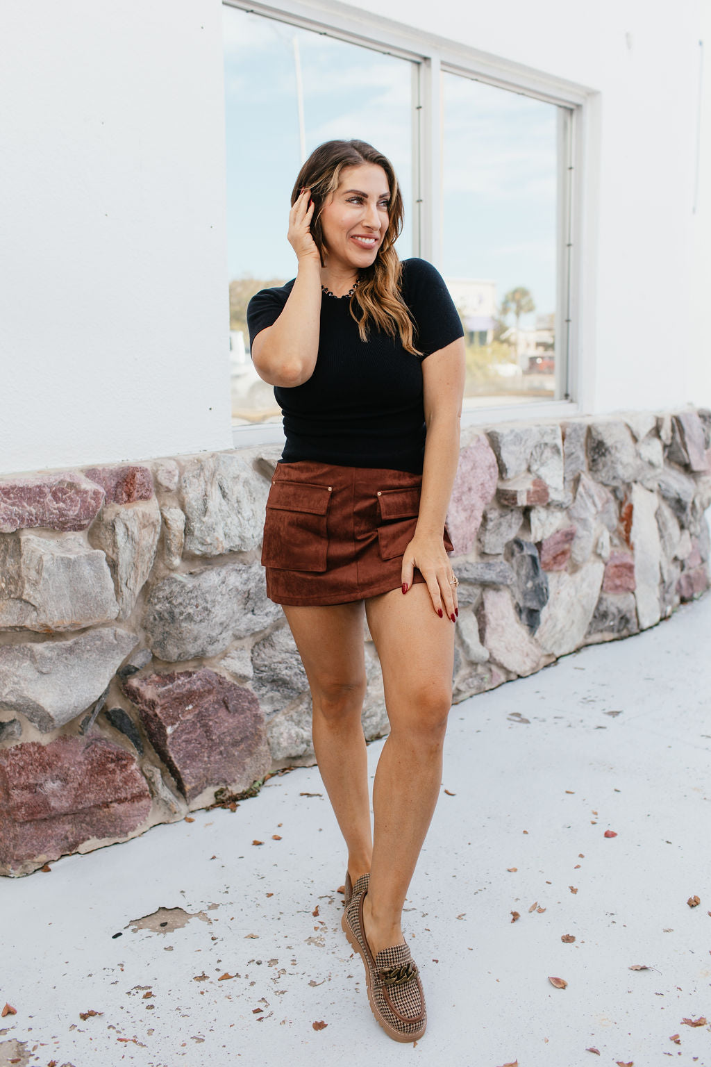 Step up your style game with this suede utility mini skirt—where luxe texture meets everyday edge. Designed with statement flap pockets and a flattering A-line fit, this skirt blends practicality with modern chic. Perfect for layering with cozy knits, edgy bodysuits, or feminine blouses, it’s your new go-to piece for effortless fall styling.