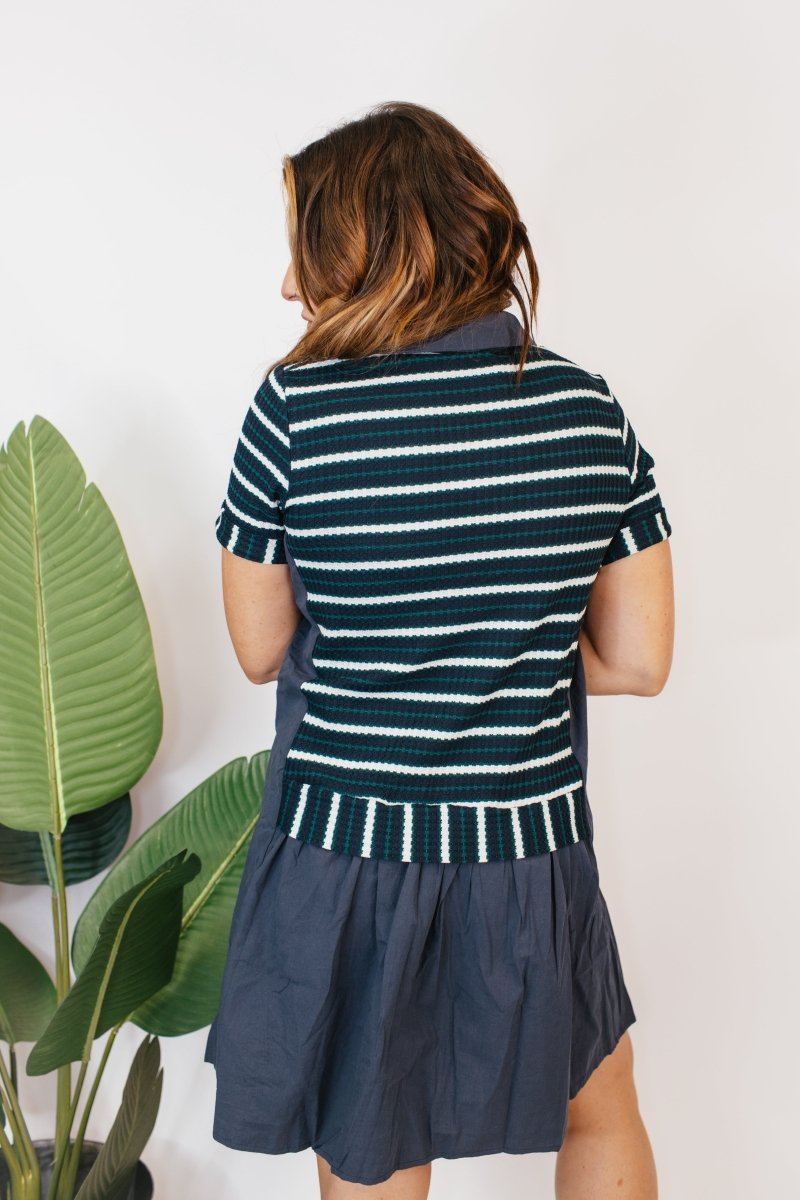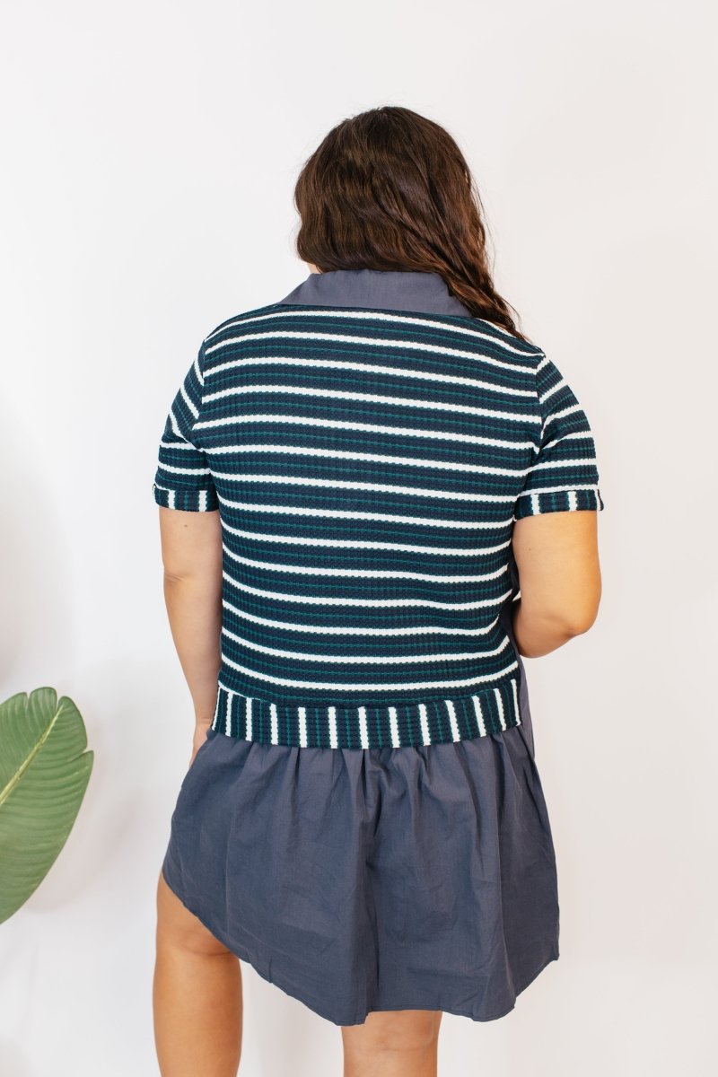 Serve effortless looks all day in this striped polo mini dress that blends preppy charm with everyday ease. The textured knit top adds structure, while the lightweight skirt keeps it breezy and flattering. Whether you're headed to brunch, errands, or the pickleball court—this one's a total win.