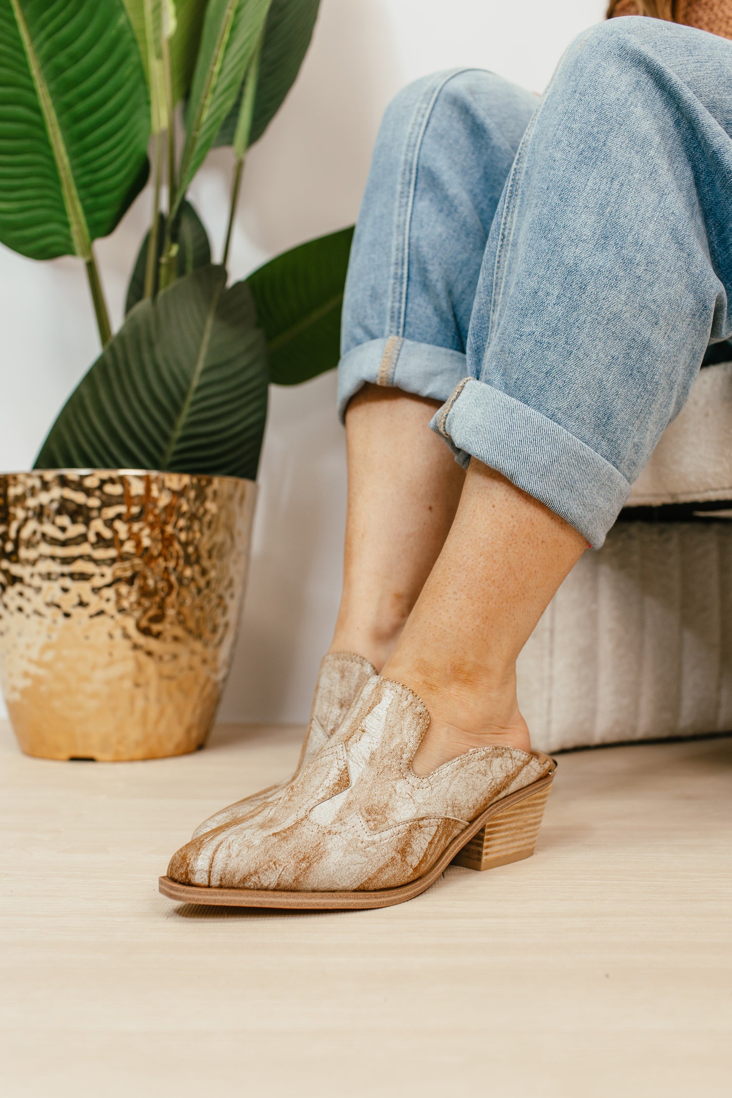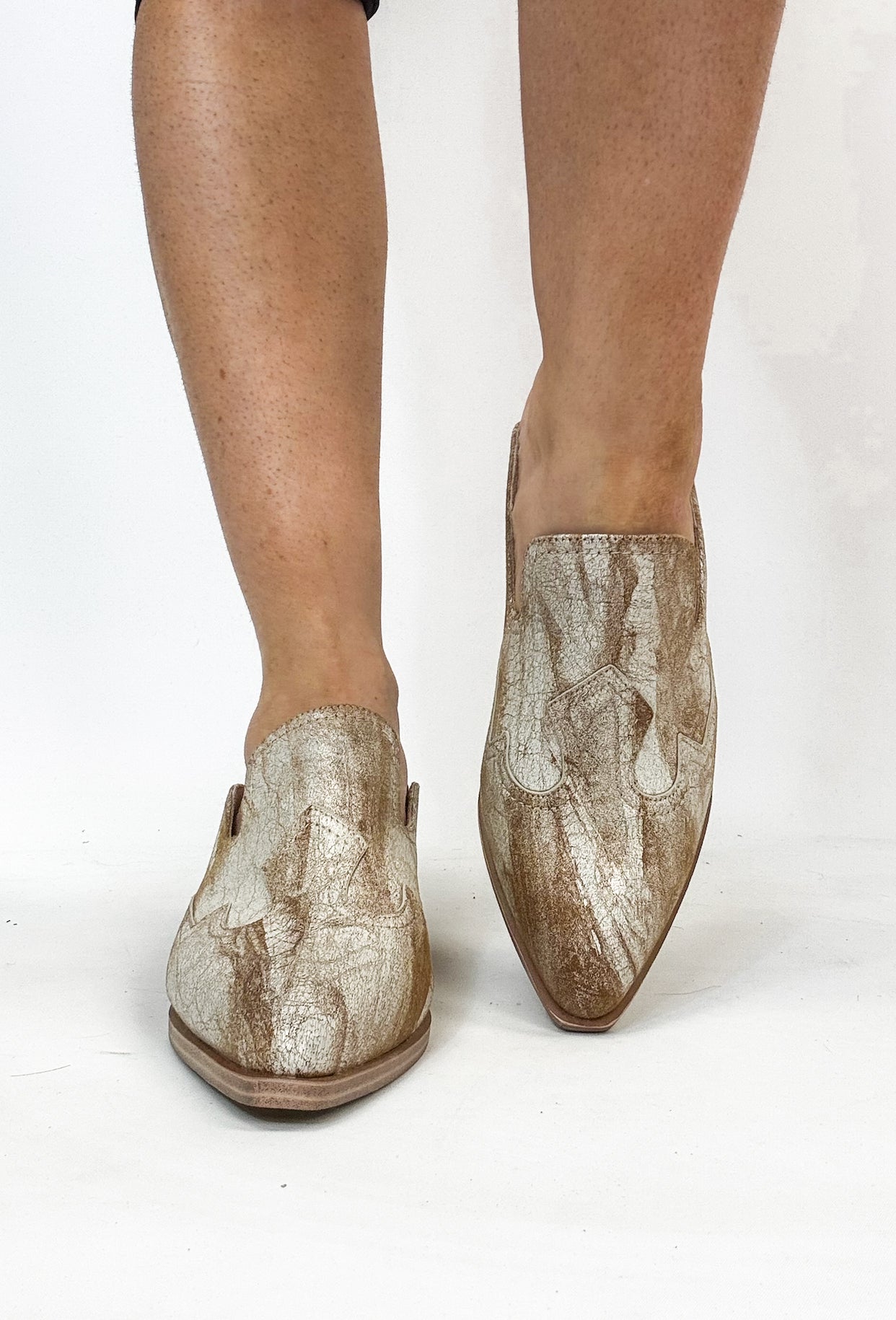 Add some shine to your stride with these distressed silver western mules. A bold take on the classic cowgirl look, they’re easy to slip on and ready to turn heads from weekday errands to weekend outings.
