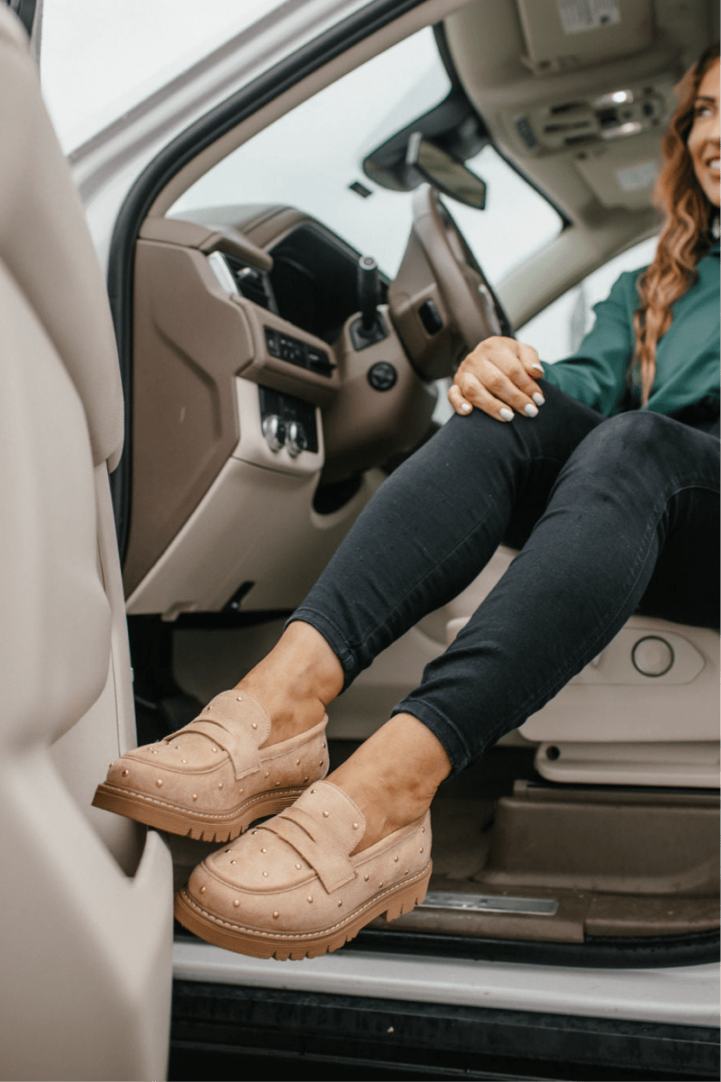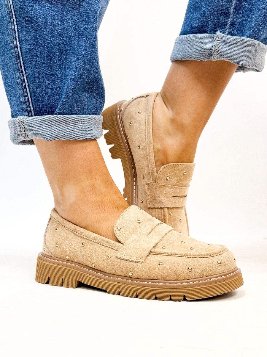 Meet your new everyday glam shoe. These studded loafers bring the perfect mix of polish and edge, with a soft suede finish that’s versatile enough for workdays or weekends. The chunky lug sole adds modern flair while keeping things comfy and practical for all-day wear. Pair them with jeans, trousers, or skirts—effortless chic just got easier.
