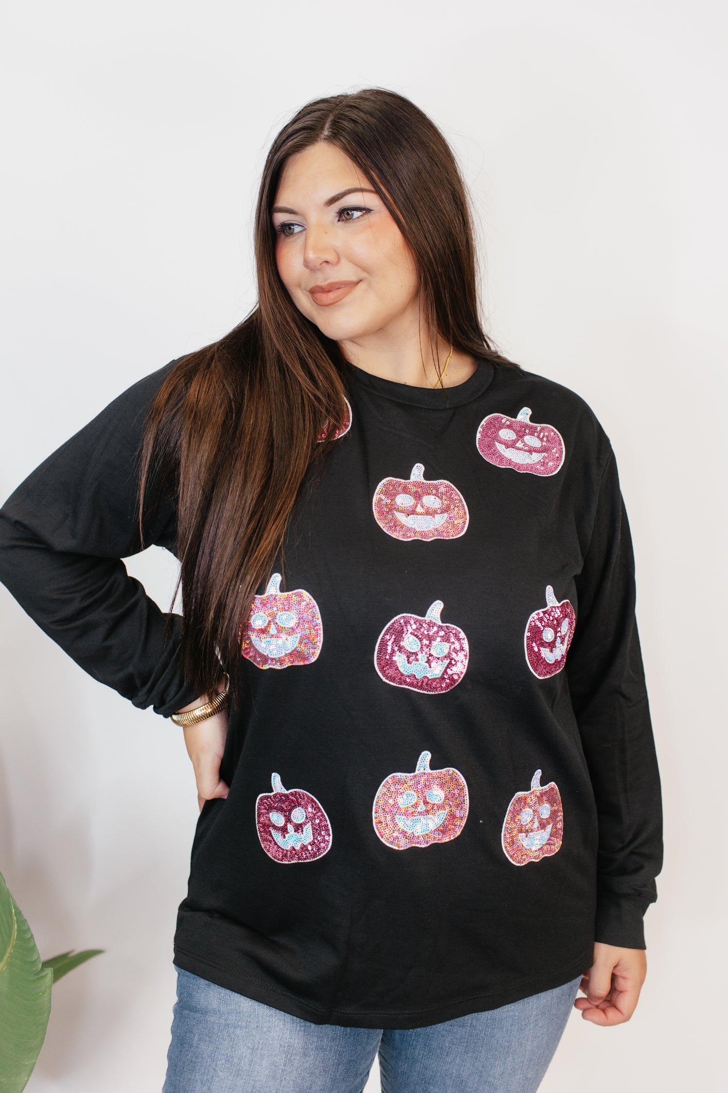 Light up spooky season with this Glitter Pumpkin Long Sleeve Top! đ⨠The cozy black base is sprinkled with sparkling pumpkin graphics that shimmer with every move. Perfect for Halloween nights, pumpkin patch strolls, or adding festive flair to your everyday style.
