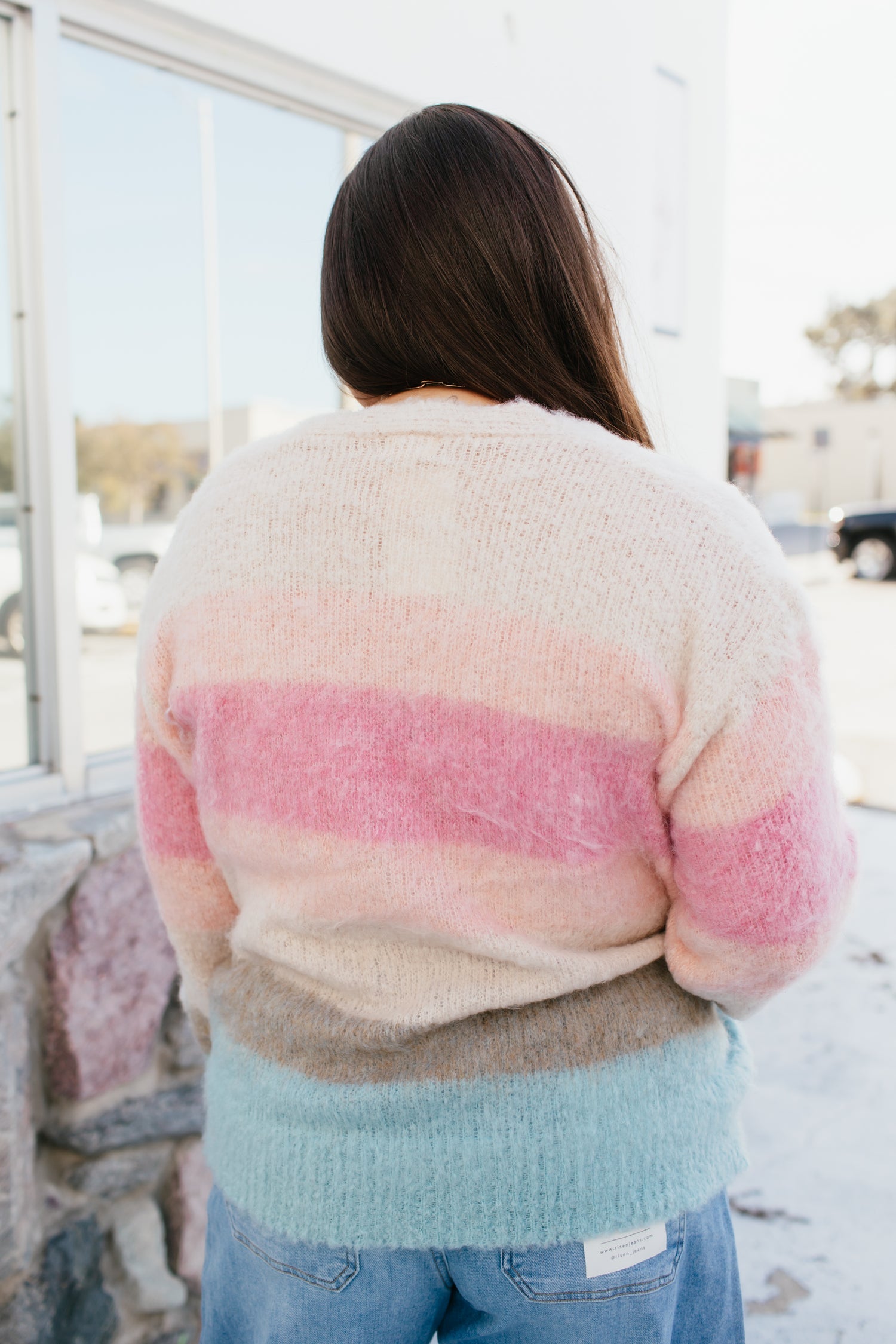 Wrap yourself in cozy sweetness with our Pastel Striped Button Cardigan, a dreamy knit that blends comfort with playful charm. Designed with soft, fuzzy yarns and a relaxed oversized fit, this cardigan features horizontal ombré stripes in shades of pink, beige, sage, and sky blue for a pastel-perfect finish.