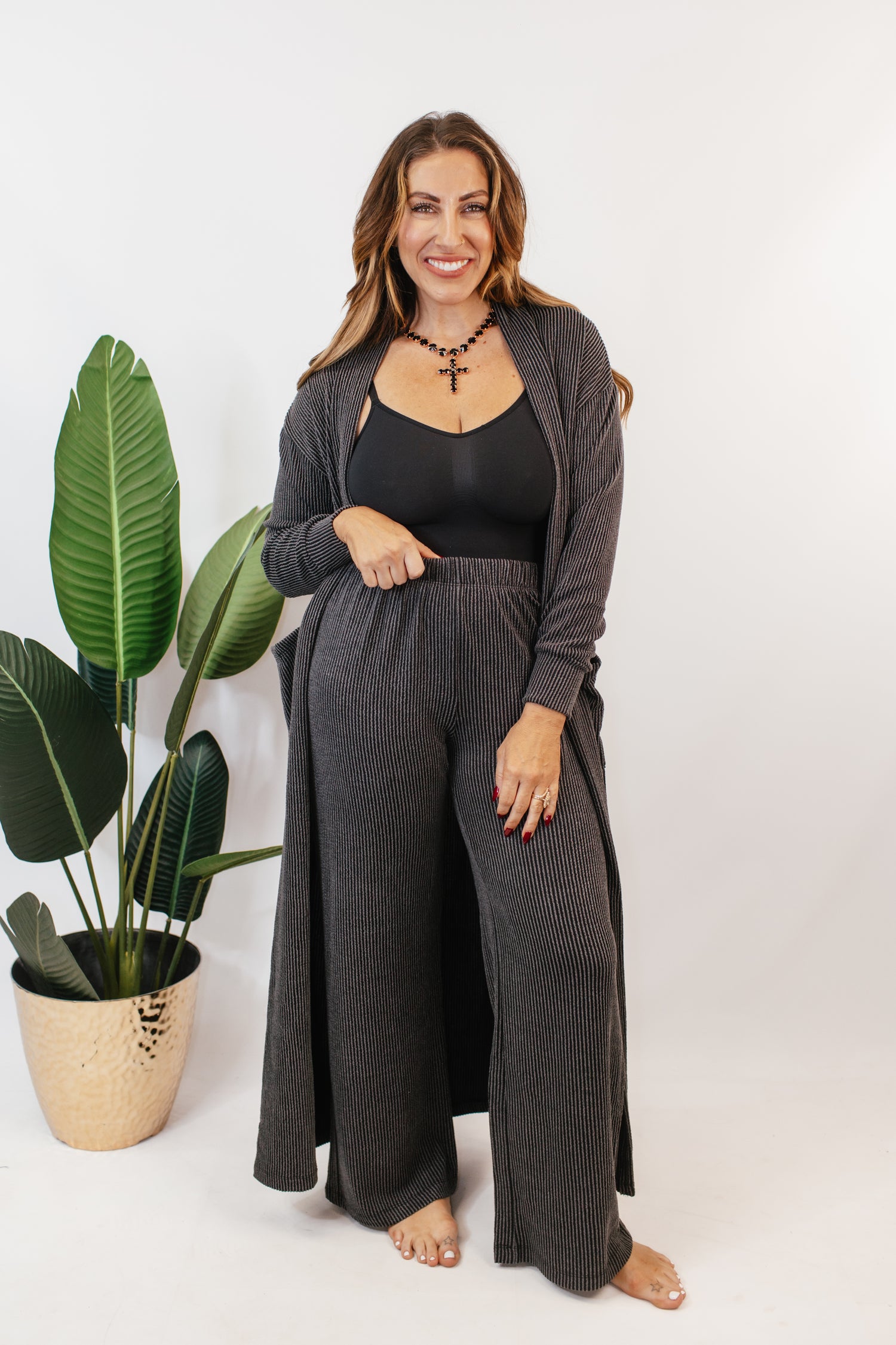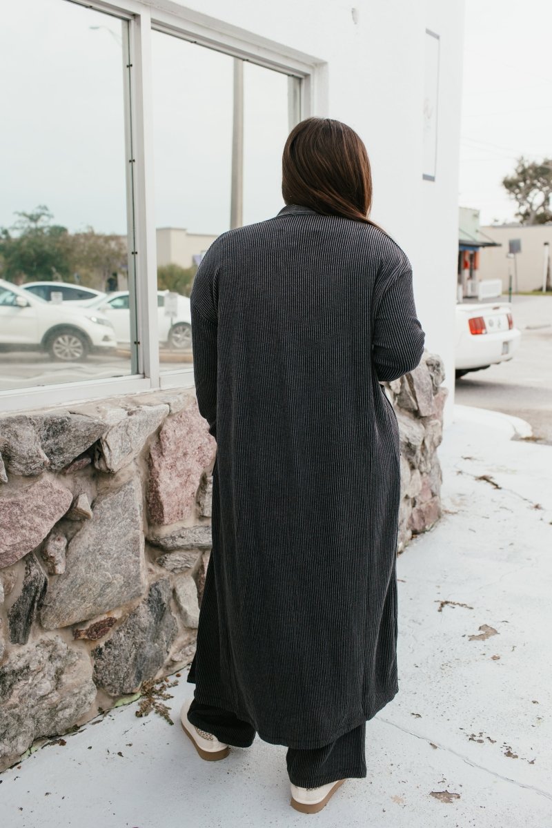 Lounge, but make it luxe. This ribbed wide-leg set with a matching duster cardigan is your new go-to for cozy days that still deserve compliments. Designed in a soft ribbed knit, it features flowy pants, an ankle-skimming duster, and roomy pockets—bringing polish and comfort together in one elevated look.