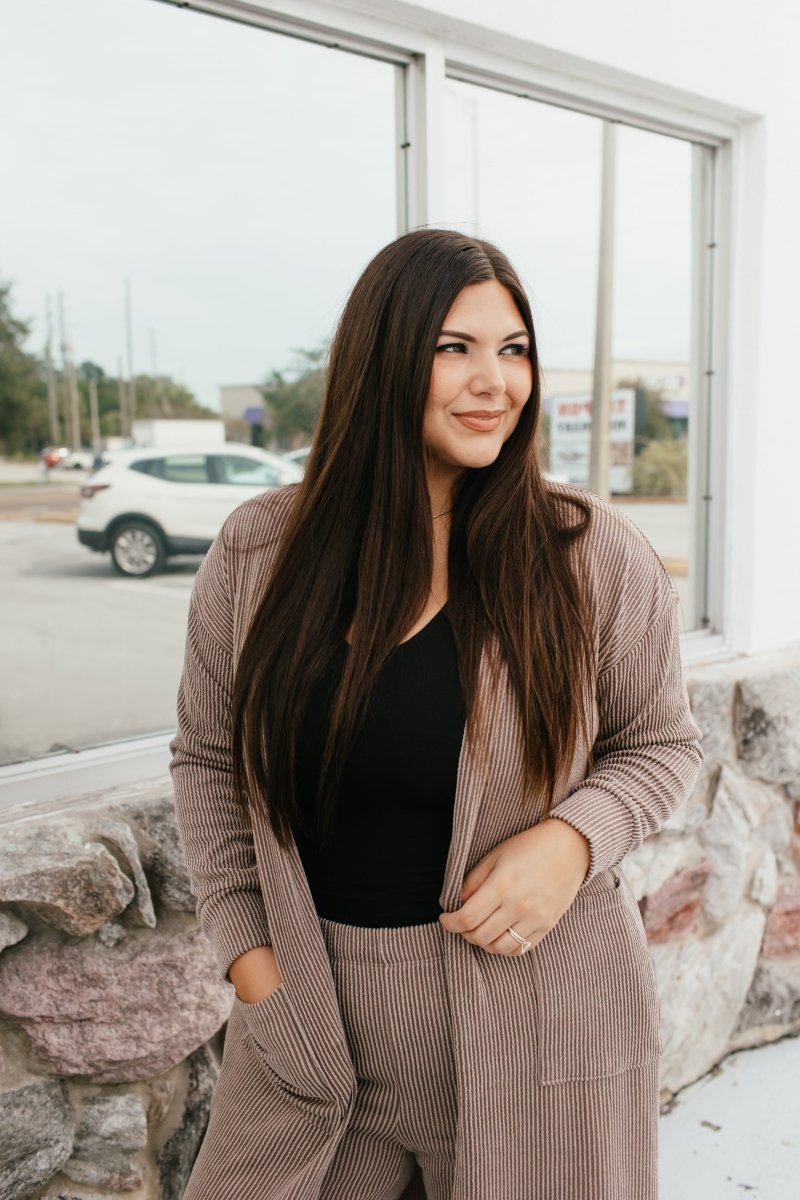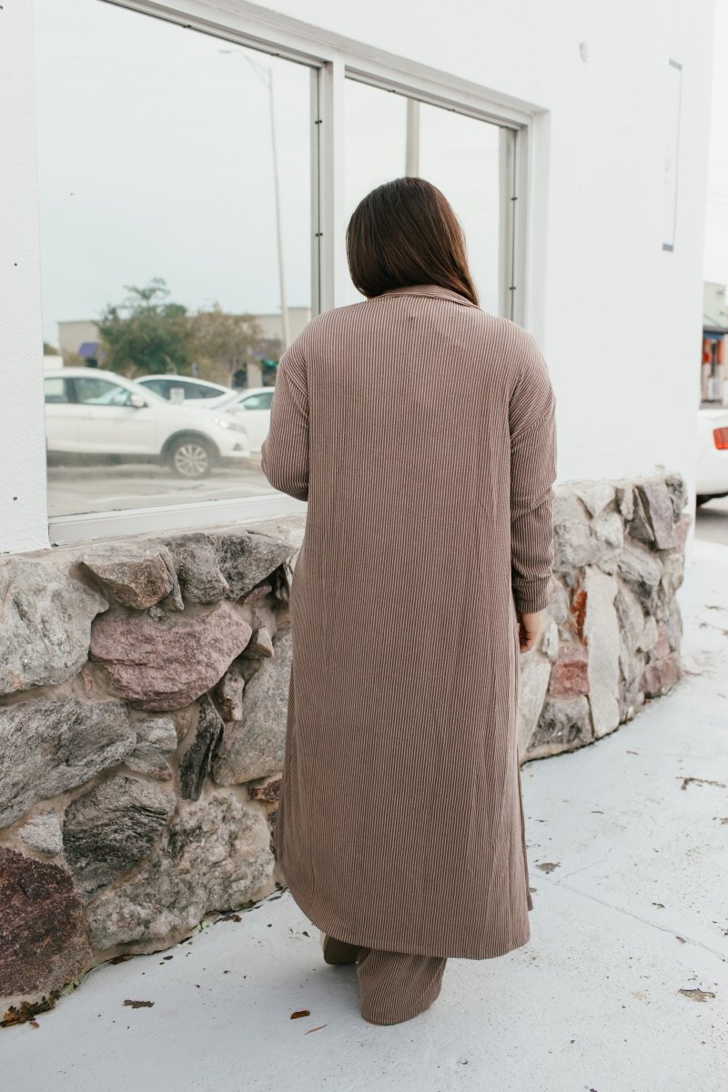 Lounge, but make it luxe. This ribbed wide-leg set with a matching duster cardigan is your new go-to for cozy days that still deserve compliments. Designed in a soft ribbed knit, it features flowy pants, an ankle-skimming duster, and roomy pockets—bringing polish and comfort together in one elevated look.