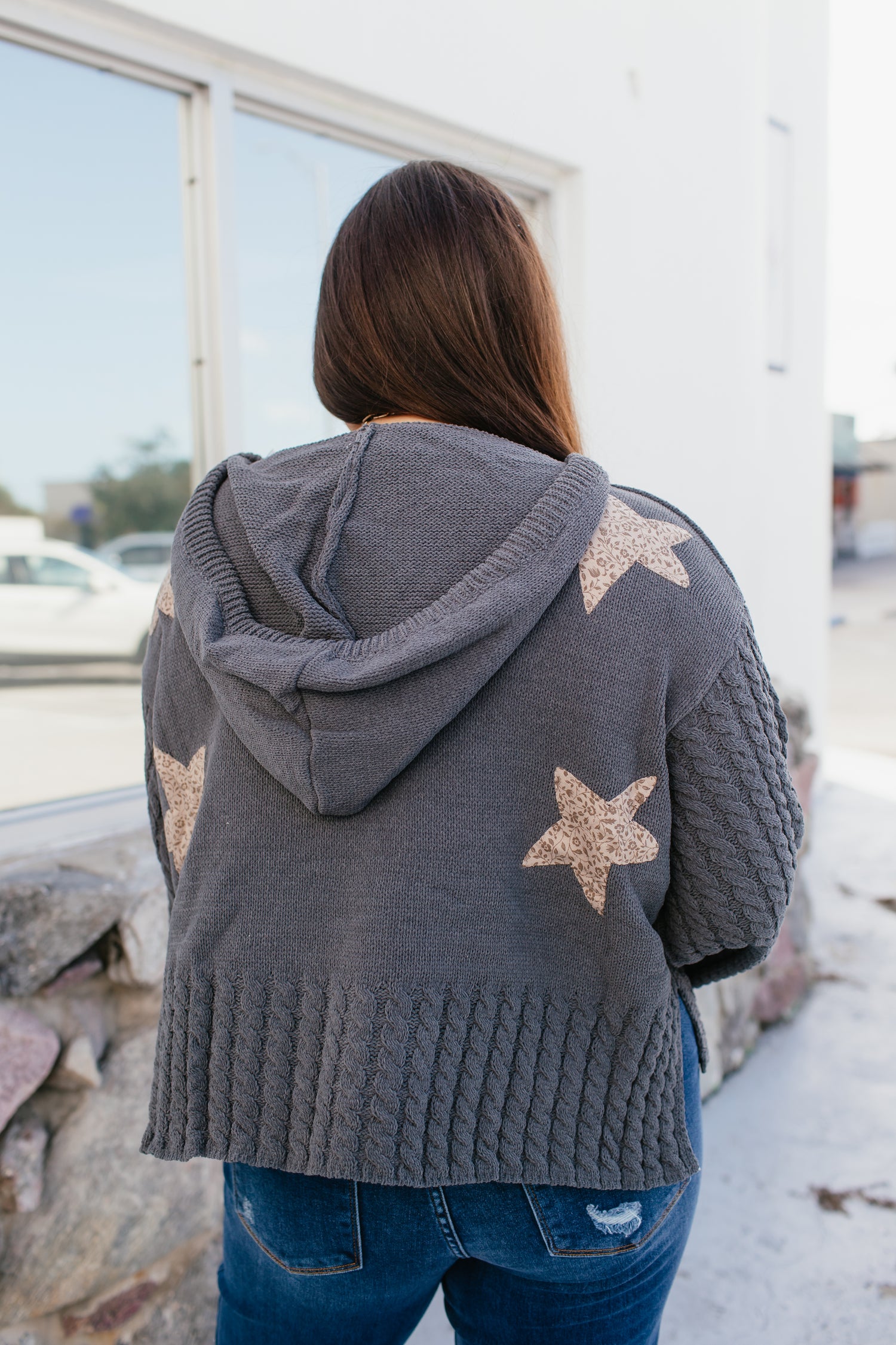 hine bright with an edge in our Leopard Star Patch Hoodie, the ultimate mix of cozy comfort and bold style. This charcoal pullover is designed with oversized leopard star appliqués, a relaxed drop-shoulder fit, and textured knit sleeves that add extra dimension. The slightly cropped hem gives it a flattering, modern silhouette, while the drawstring hood keeps it casual and easy to wear.