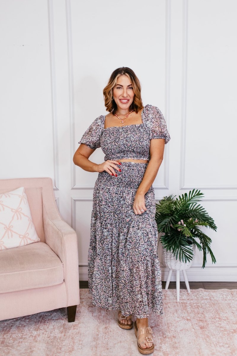 Flirty, floral, and full of charm—this smocked two-piece set is a must-have for spring and summer days. Featuring a soft square neckline, puff sleeves, and an elasticized waistband, it flatters your curves while keeping you comfy. The delicate ditsy floral print adds a romantic, feminine touch that pairs beautifully with wedges or slides.